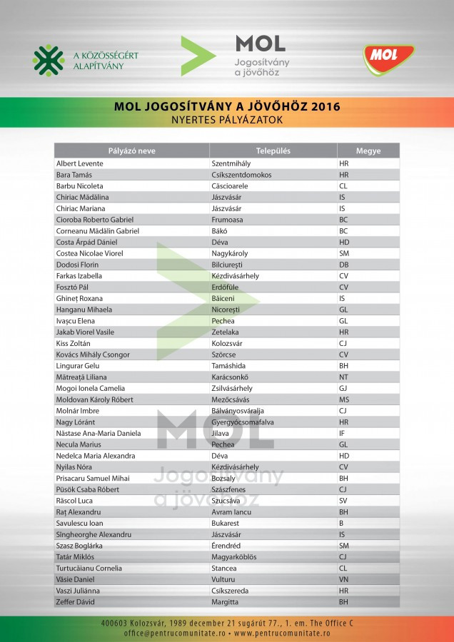 A nyertes fiatalok Bukarestből, valamint Bákó, Bihar, Călărași, Dâmbovița, Galac, Gorj, Hargita, Hunyad, Iași, Ilfov, Kolozs, Kovászna, Maros, Neamț, Szatmár, Suceava és Vrancea megyéből származnak. A nyertesek listája a www.molromania.ro és a www.pentrucomunitate.ro honlapokon megtalálható.