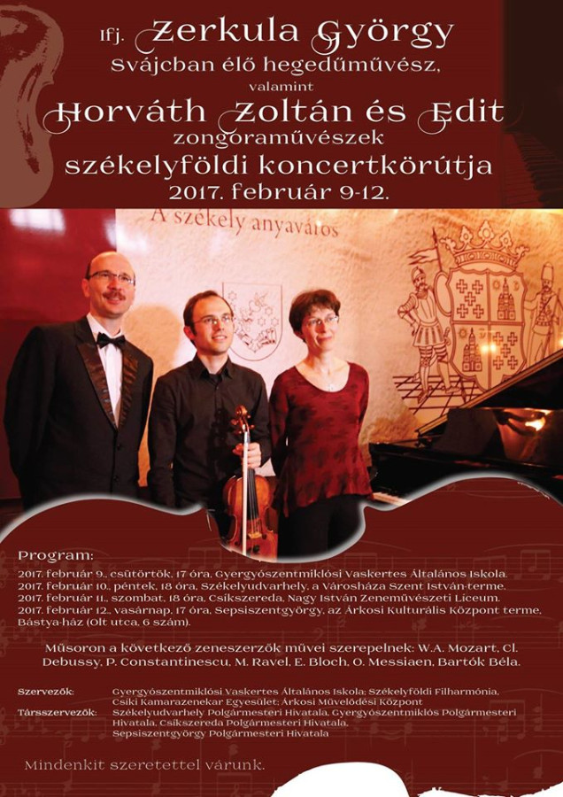 Székelyföldi koncertkörúton vesz rész ifj. Zerkula György Svájcban élő hegedűművész, valamint Horváth Zoltán és Edit zongoraművészek február 9-12. között.