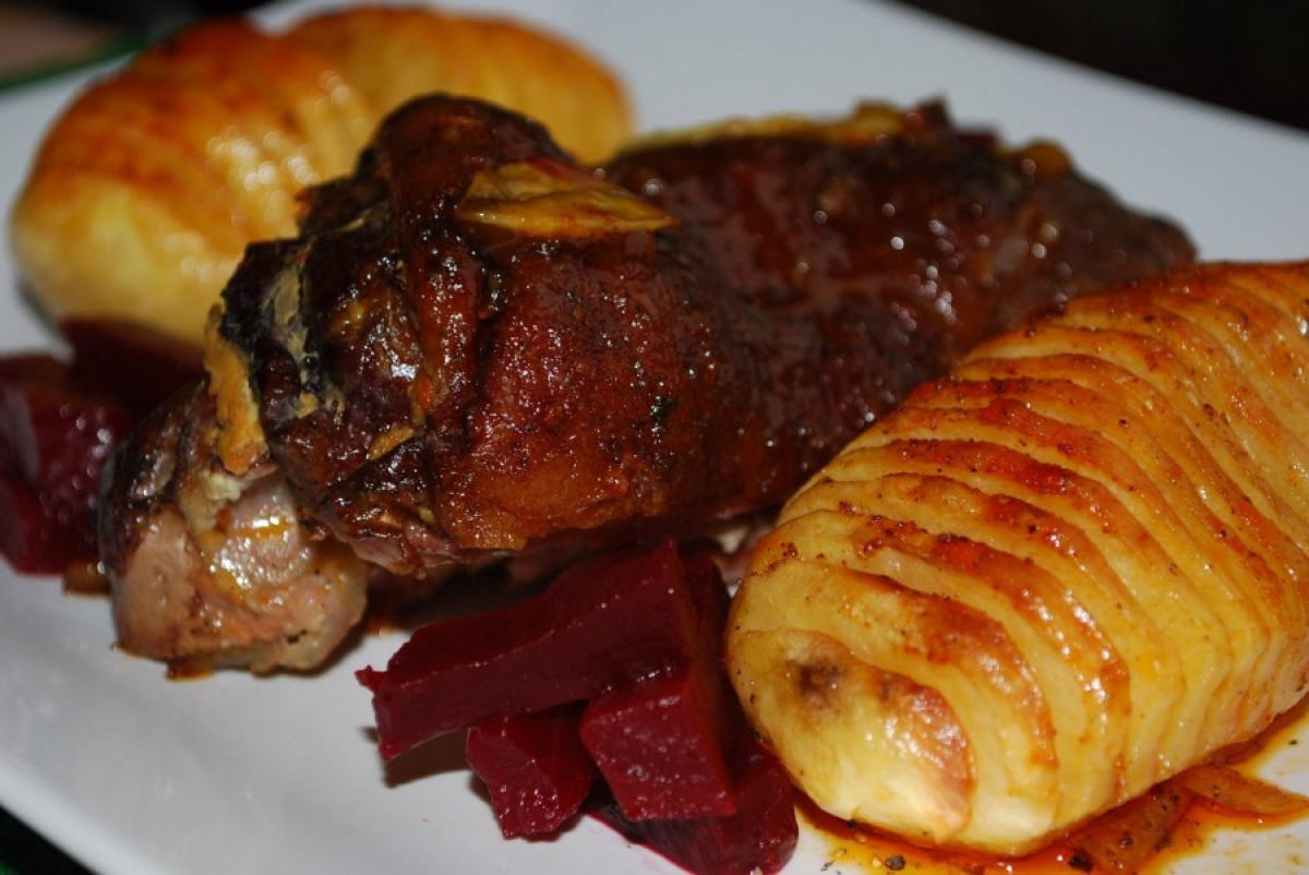 Másnap már csak annyi a dolgunk, hogy elővesszük a jénai, római, pataki, vagy bármely más náció e célra alkalmatos tálját 🙂, belehelyezzük a csülköt, meglocsoljuk sörrel, és máris indulhat a nem túl forró sütőbe (kezdetben lefedve). Néhány óra után felfedjük bájait, bőrpirítás céljából. Gyakran locsolgatjuk kiszáradás ellen (természetesen begyulladt torkunkról sem feledkezve meg 🙂). Köretnek most Hasselback krumplit készítettem (mert ráértem), és céklával tálaltam.