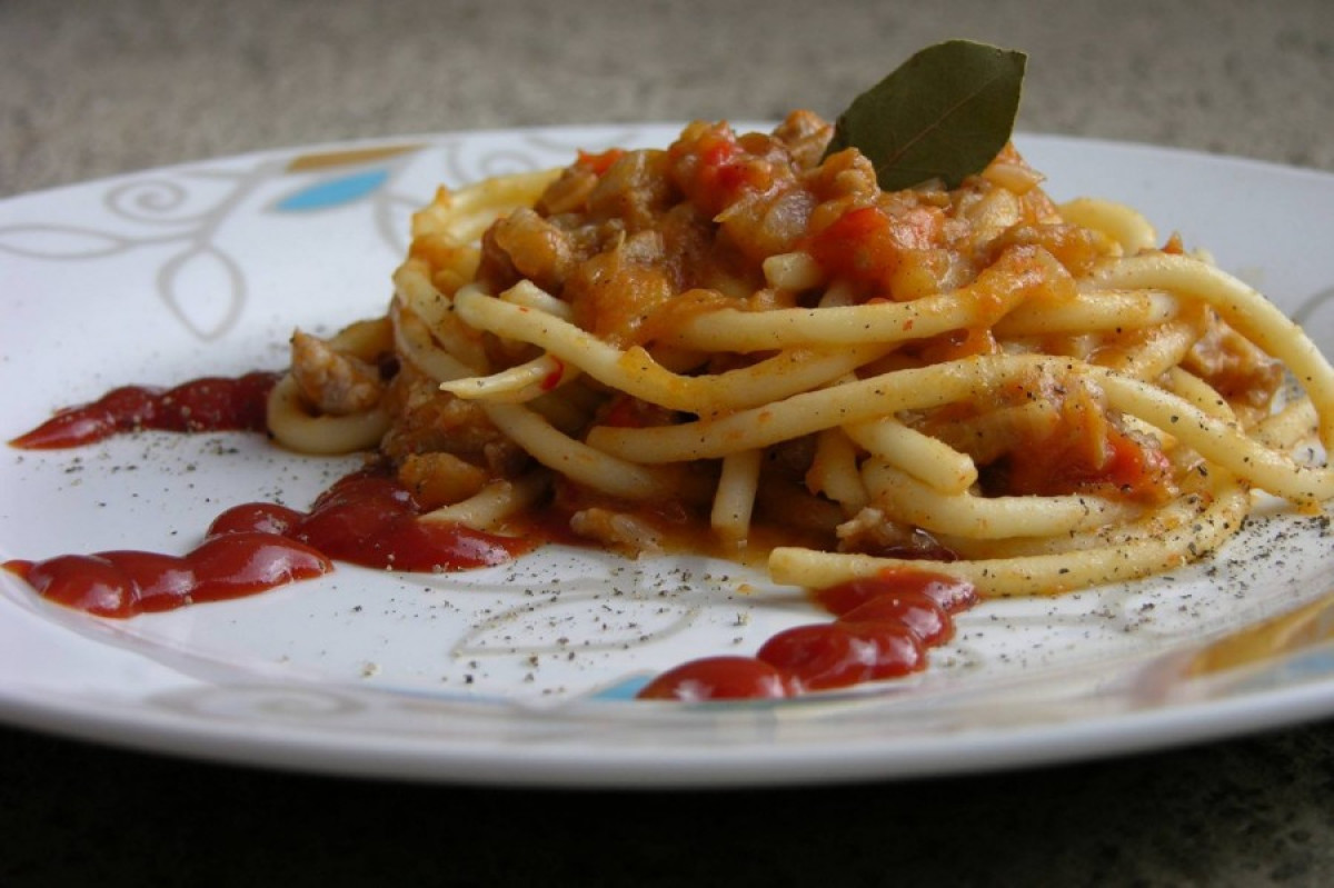 Ötlet híján, szét szoktam nézni a hűtő-kamra-pince bermudai háromszögemben, ahol ugyanis (a változatosság kedvéért) nem eltűnnek a dolgok, hanem előtűnnek. Mindig a szemembe ötlik valami, amit esetleg meg lehet sütni, főzni. Most például egy üveg lecsóféleség ötlött, és ebből lett az ötlet. Ami egyébként csak azért féleség, mert zöldparadicsommal készült. T.i. Gyergyóban, szabad levegőn, maximum zöldparadicsomot lehet érlelni (plusz 3 db. pirosat, hogy mégse lehessen rám fogni a háryjánoskodást 🙂 . De sebaj, a zöldcsütörtökhöz passzol a zöldparadicsom. Gazdagítva egy kis darált hússal, meg is született a Bolognese à la Gyergyó fantázianéven futó ebédünk. Ráadásul makarónival, amit előfőztem még a tegnap, amikoris túrós makaróni készült. Lévén, hogy a lobogó vízbe túl sok makaróni vetette bele magát (valami öngyilkossági hullám söpörhetett végig rajtuk, vagy csak szimplán fáztak), maradt belőle mára is. Kissé felmelegítettem, hogy meredt tagjaikat kiegyenesíthessék, majd összekevertem a lecsóval.