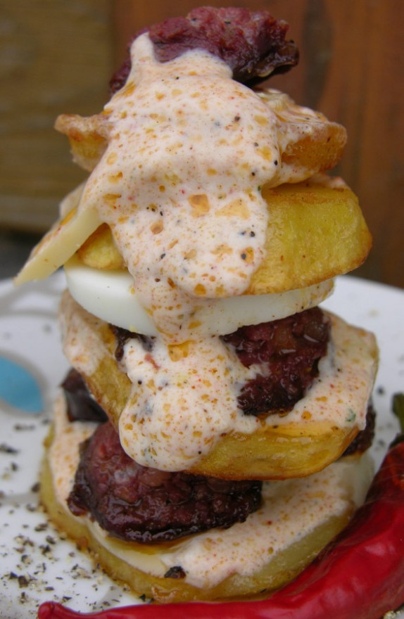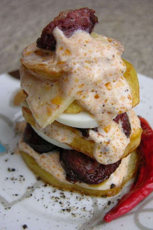 Hát, nekem most nagymértékben görcsben áll a gyomrom, drukkolok is rendesen, hogy még véletlenül se tévedjen erre egy kósza napsugár se! 🙂 Közben meg persze kísérletezgetek. Ugyanis a rakott krumpli az az étel, amely nálam végeredményileg feszt 🙂 igen száraz vagy igen locsogós lesz, de még véletlenül sem az, amit szeretnék. Eredeti receptje szerint felkarikázzák a főtt krumplit, rá a főtt tojást, reszelt sajtot, vajdarabkákat, tejfölt, esetleg kolbászt, mindezt szépen lerételve egy tepsibe. Mivel így máig sem sikerült elnyernie tetszésemet, kissé újragondoltam a receptet.