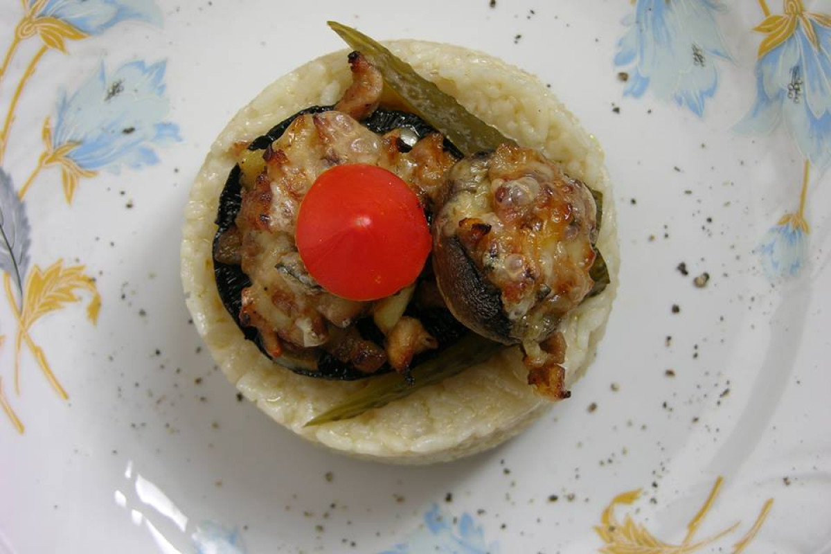 Visszatérvén a gombára, kukoricás, fokhagymás rizságyra fektettem, persze, miután megtöltöttem a következő vegyülettel (nem kémiai, konyhai!): sonka, sajt, paprika, zöldhagyma, só, bors. Mindezen összetevők pedig apró kockákra vagdosva kapaszkodtak egymásba, hogy egy kalapnyi kis helyen minél többen elférhessenek. 🙂 A jó meleg hatására végezetül meg szépen egymásba olvadtak.