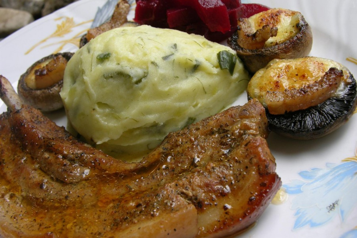 Indultak utána gombafejek is, túróval és szalonnával, ha már lúd (disznó), legyen kövér alapon. A krumplipüré meg az amúgy saját kerti hagymák zöldjével gazdagodott, színben és ízben egyaránt.