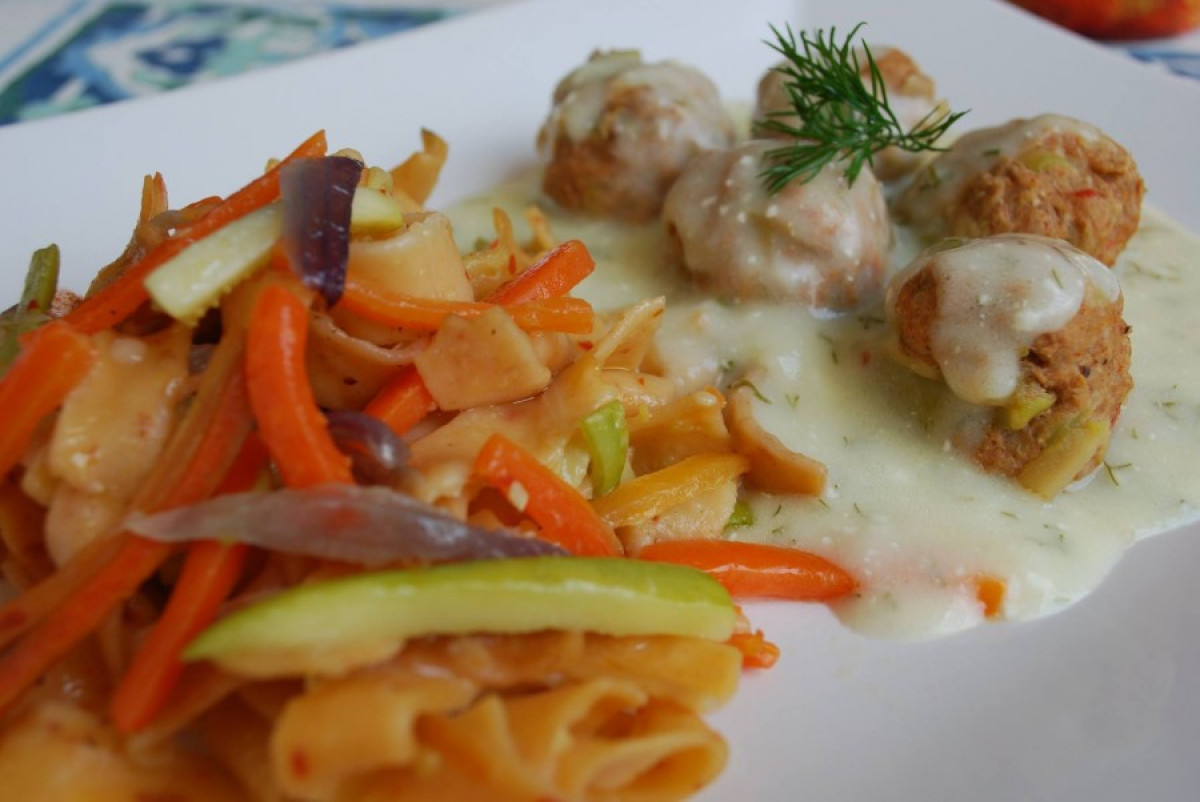 Nálam, talán ez okból is, mindenféle gáz száműzetett a házból, prioritást élvezve ezáltal mindenféle elektromos szerkezet (kivétel a villamosszék 🙂). Mustárt ellenben használok, nagy mennyiségekben, például szószok, mártások készítésénél is. Ma is került a kaporszószba egy leheletnyi, a kukoricakeményítő, cukor, só, tejföl mellé. A kaporszószba pedig főtt húsgombócok vándoroltak, húsevő embertársak örömére. 🙂 Köretnek pirított zöldséges szélesmetélt társult, murokkal, hagymával, paprikával, paradicsommal, cukkinivel és káposztával.