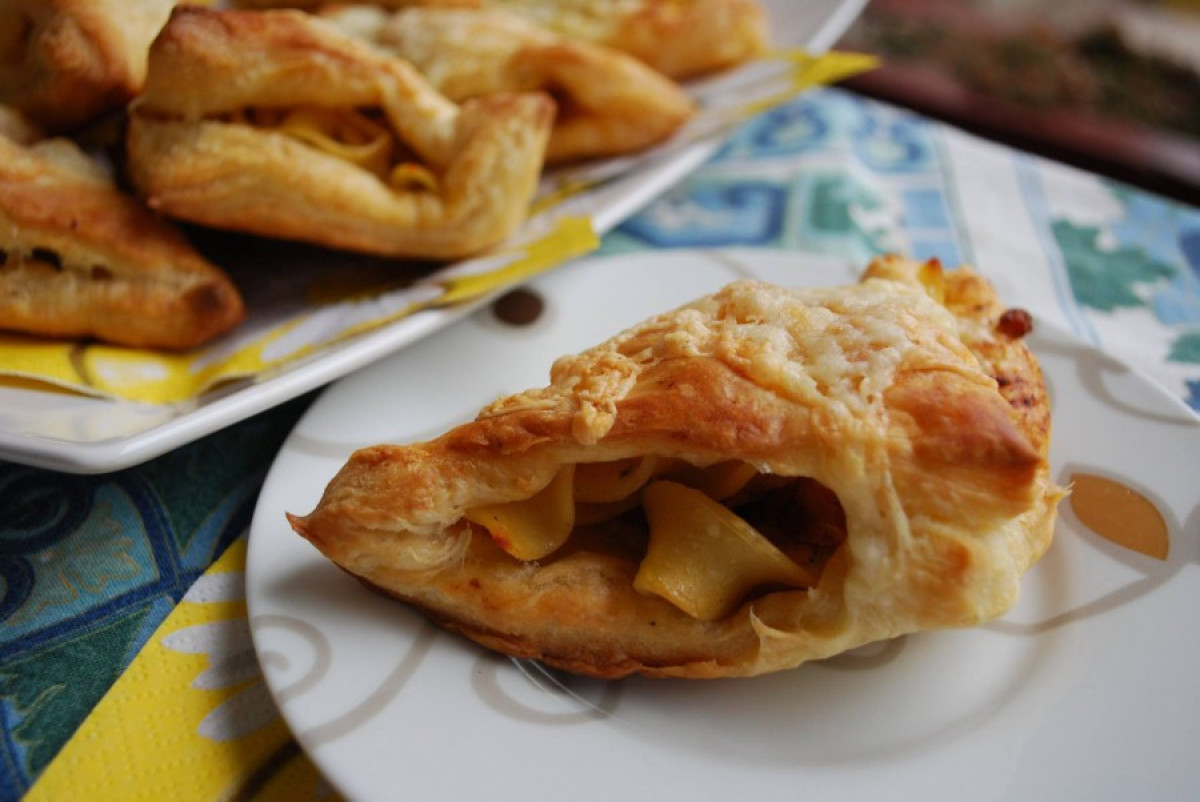 Őszintén bevallom, a lap bolti, ugyanis a fagyasztók polcain egész finomakat lehet lelni. A tölteléke főtt tagliatelle (ez volt épp kapható a kamrapolcon), enyhén lecsós (paprika, hagyma, paradicsom, murok, cukkini) darált hús, jól megszórva borssal, oregánóval, enyhén csípős paprikával. A négyzetekre vágott réteskockákba kanalazva, ezeket háromszögesítve, sajttal megszórva, ropogósra sütve. Fogyasztás előtt kis medvehagyma-pestóval kenegetve. 🙂