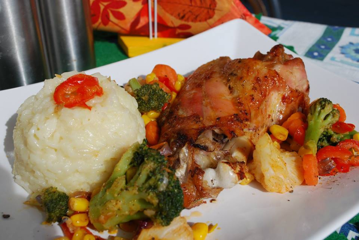 Az előfőzött, majd pirosra pirított pulykaszárny, fehér rizzsel és háromszínű (kaliforniai paprika, karfiol, brokkoli) zöldségkörettel teszi ünnepivé eme szép napot.