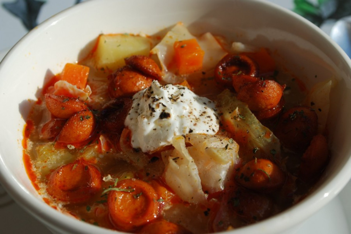 A levesben kelkáposzta-, murok-, hagyma- és krumplikockák főnek, köménnyel bőkezűen szórt, víz alapú, sós, borsos, majoránnás lében. Pirospaprikával, zúzott fokhagymával színezett, ízezett olajon virslikockák pirulnak, majd a zöldségekkel, tejföllel társulnak. 😋