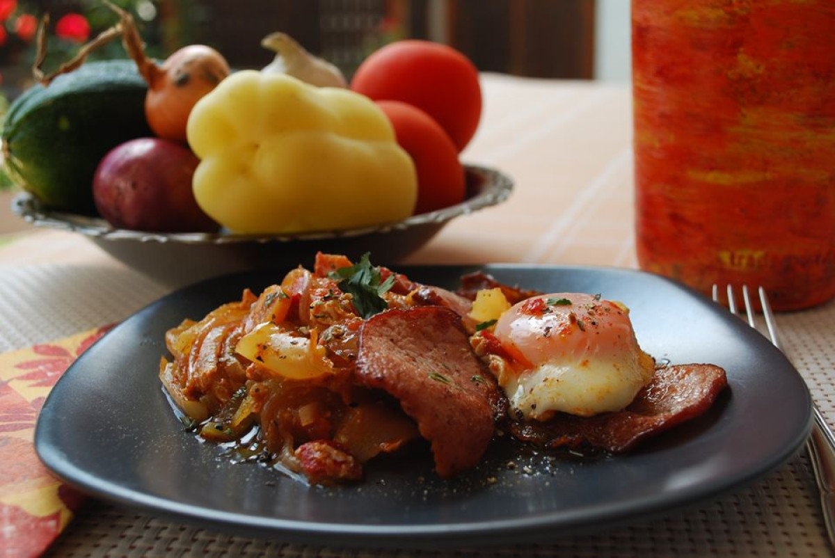 Nyáron az egyik kedvenc eledelem a lecsó. 😋 Érik a hozzávaló a kertben, egészséges is, hát fogyasztjuk nyakra-főre. A lecsó amúgy olyan étel, amely kétszer ugyanúgy úgysem sikerül, pillanatnyi íze függ a felhasznált zöldségektől és ezek mennyiségétől. Készülhet kolbásszal, rizzsel, tojással, sőt, akár köretként is szerepelhet, sült húsok mellé. Ma pedig a közel-keleti lecsóba (ha mi manapság csak a gravitációt legyőzve juthatnánk oda 😳, bár egy íz és illat szálljon felénk), a shakshukába kóstolhatunk bele. Szükségeltetik hozzá hagyma, paprika és paradicsom, mely ugyebár a lecsói népmesék bűvös hármasa. 😉 Társul hozzá fokhagyma, őrölt- és római kömény, pirospaprika, só, bors és harissa (mivel nem jellemzően a gyergyói konyhák fő fűszere, akár ki is maradt belőle). Mindezeket szépen összepirítjuk, friss petrezselyemmel, korianderrel, mentával ízesítjük, tetejére kis vájatokba tojást ütünk, végezetül meg nagy élvezettel elfogyasztjuk. ☺️