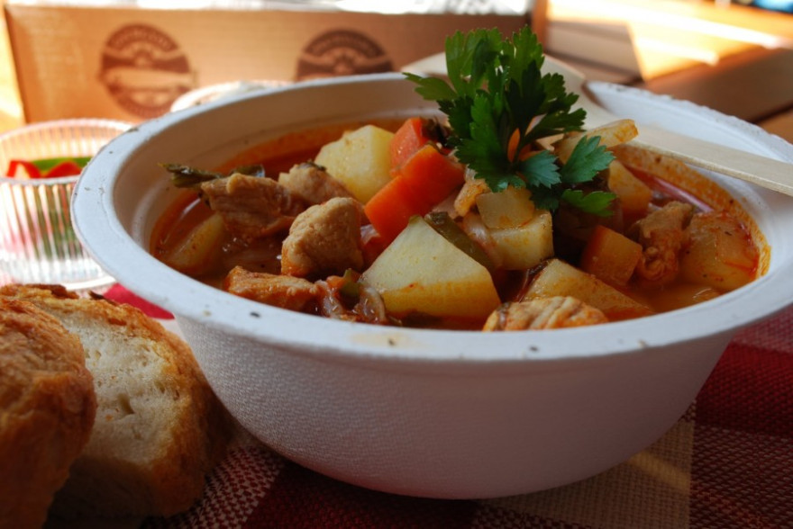 Hozzávalók: 50 dkg sertéshús, 1 hagyma, 2 krumpli, 2 murok, 1 kis zeller, 1 petrezselyemgyökér, egy szelet friss káposzta, két marék zöldborsó, néhány karfiolrózsa, 1 dl paradicsomlé, 1 evőkanál paprikakrém, lestyán, tárkony, korpacibere vagy citromlé. Tejfölt, csípős paprikát kínálhatunk hozzá.