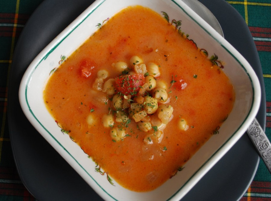 Hozzávalók (ez most majdhogynem egy vegetáriánus változat): két nagy szelet szalonna, 1 nagy hagyma, 2 murok, 1 piros kaliforniai paprika, 15 dkg csicseriborsó, 15 dkg vörös lencse (jómagam ezt konvertáltam át humuszra), 3 paradicsom, 2 ek. paradicsompüré, fél csokor friss petrezselyem és koriander, 2 szárzeller, 2 cikk fokhagyma, só, 1 tk. frissen őrölt bors, 1 tk. kurkuma, 1/2 tk. őrölt fahéj, 1 tk. őrölt gyömbér, 1/2 citrom leve. Dísztítőelemként dobhatunk bele egy marék, csíkokra vágott mángoldot, vagy spenótot.