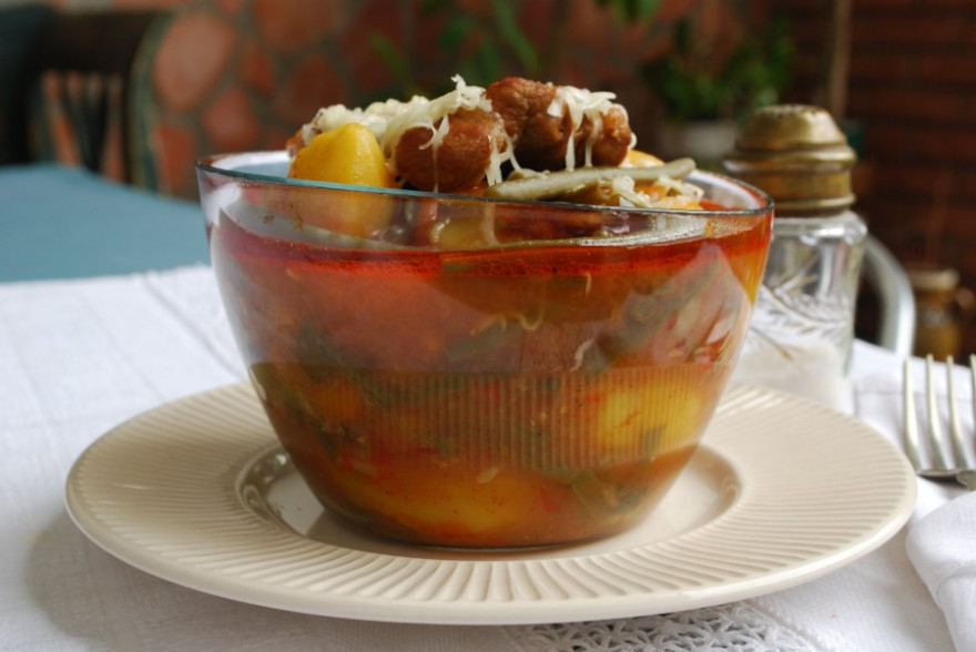 Hozzávalók: 500 g bárányhús, 4–5 krumpli, 4 paradicsom, 3–4 fej hagyma; 1 pohár zöldpaszuly, 2 zöldpaprika, 1 pohár zöldfűszer (bazsalikom, korianderlevél, kapor, borsfű), 1/2 kávéskanál őrölt fekete bors, 3/4 pohár aszalt barack. Elkészítése: a zöldségeket vágjuk egyforma darabokra. Rakjuk le rétegekben cserépedénybe. Szórjuk be zöldfűszerekkel, borssal és sóval, rakjuk a tetejére a bárányhús darabjait. Öntsük le forralt vízzel úgy, hogy befedje a húst. Szorosan zárjuk le fedővel, és tegyük 2 órára sütőbe.