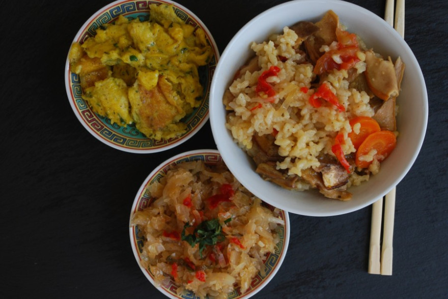 Mivel mostanság távol-keleti hangok áramlanak a fülembe (meg kifele az ajtón ), lényegesen megnőtt a rizs-, szójaszósz-, szezámolaj-, üvegtészta-, tofu-, gyömbér-, kínai kel-, csípőspaprika- és zöldhagyma-fogyasztásunk. Ez nem baj, mert fenséges ételek állíthatók elő ezen alapanyagokból. Ha valamely zöldségeket (ami épp fellelhető lakunkban) szezámolajon lepirítunk, üvegtésztával és szójaszósszal keverünk, szezámmaggal szórunk, nem győzünk majd áradozni a végeredmény pazarságáról!