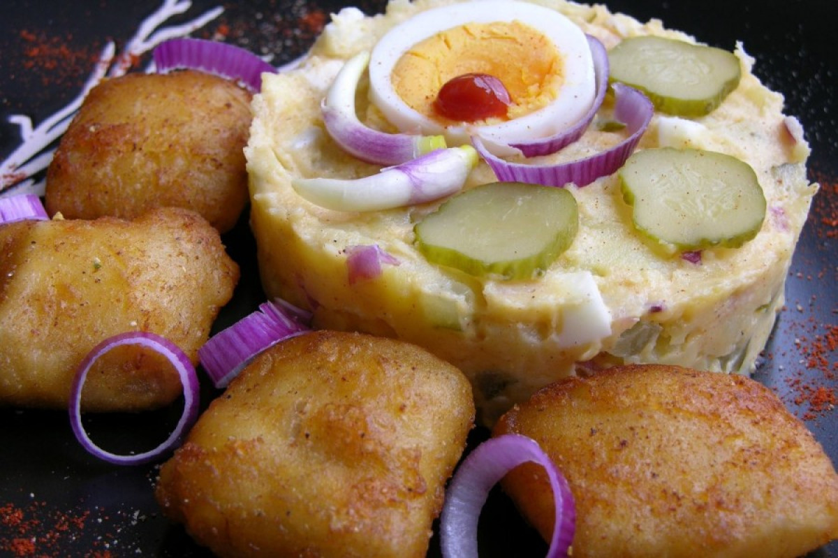 A fagyasztott hallal az ember mindig veszélyes vizekre evez, már csak azért is, mert kevésnek nem nevezhető pénzért, általában, nagyobb mennyiségben, fagyasztott vizet vesz hal helyett. Amellett az a kicsi hal is eléggé megviselt, mire tengernyi szenvedés után ideér, olyannyira hogy darabjaira esik szét. De mivel egészséges, a szervezetünknek szüksége van rá, meg ételt egyébként sem dobunk el (mint, ahogy könyvet sem égetünk!), óriási türelemmel bundába öltöztetjük őket, majd forró olajba helyezve, ehető falatokká varázsoljuk. Nem mondhatom, hogy nagyon szórakoztató, ezért kárpótlás gyanánt, munka közben, a zene hullámain ringatózunk, pisztráng ötösöket úsztatván hallójáratainkba. Körítésnek pedig, mármint a hal mellé, majonézes krumplit készítek. Amibe a szokásos főtt krumpli, tojás, hagyma mellé, savanyú uborkát szoktam kockázni.