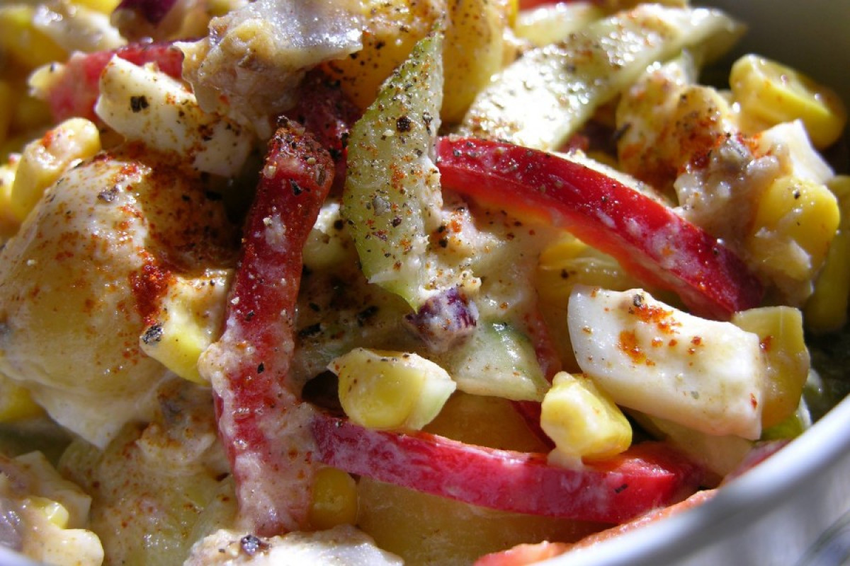 Ezek általában salátákból állnak, melyeknek elkészítése is igen egyszerű: álldogálok egy kicsit a hűtő előtt, de nem csak amúgy tétlenül, gyorsan felmérem, hogy tartalmából mi talál mivel. 🙂 Savanyú uborka, paradicsompaprika, főtt tojás, kukorica, krumpli, halkonzerv. Ezeket szépen kockára vágom (vagy csíkokra, de csak a változatosság kedvéért), és nyakon öntöm öntettel: só, bors, cukor, balzsamecet (avagy citromlé).