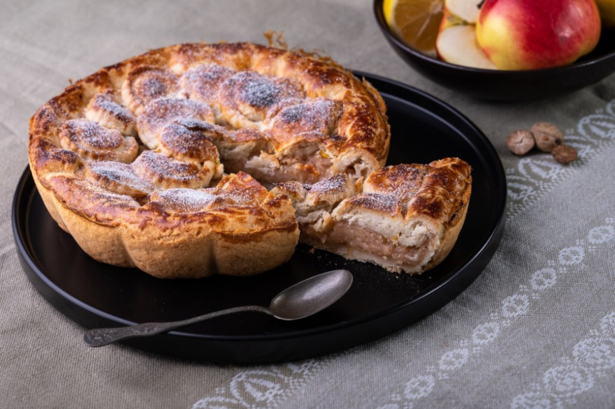 Tésztája tartalmaz 35 dkg finomlisztet, 18 dkg vajat, 2 ek porcukrot, 1 csipet sót, 30 ml vizet, a töltelék pedig 80 dkg almát, 13 dkg cukrot, 2.5 evőkanál finomlisztet, 1 kk fahéjt, 0.25 kávéskanál szerecsendiót, 1 ek citromlét, 4 dkg vajat. A tészta felével kibéleljük a tepsit, rákanalazzuk a tölteléket, majd beborítjuk a maradék tésztával és megsütjük.