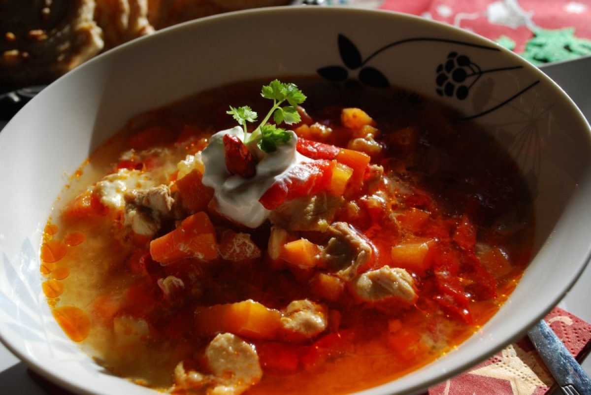 Elkészítése: Hideg vízbe tesszük a húst, a csontokat, és a zöldségeket, sózzuk, borsozzuk majd addig főzzük, míg megpuhul (ha egy murkot lereszelünk, olajon megdinsztelve a leveshez öntjük, sokkal szebb színeket kapunk!). A levest átszűrjük, a húst hosszúkás darabokra vágva visszadobáljuk, beletesszük a csíkokra vágott paradicsompaprikát is. A liszttel kikavart tojássárgát, kevés forró lével elegyítve, rátöltjük a levesre és folytonos keverés mellett, lassú tűzön felforraljuk. A paradicsompaprika levével ízesítve, tejföllel, akár csípőspaprikával tálaljuk.