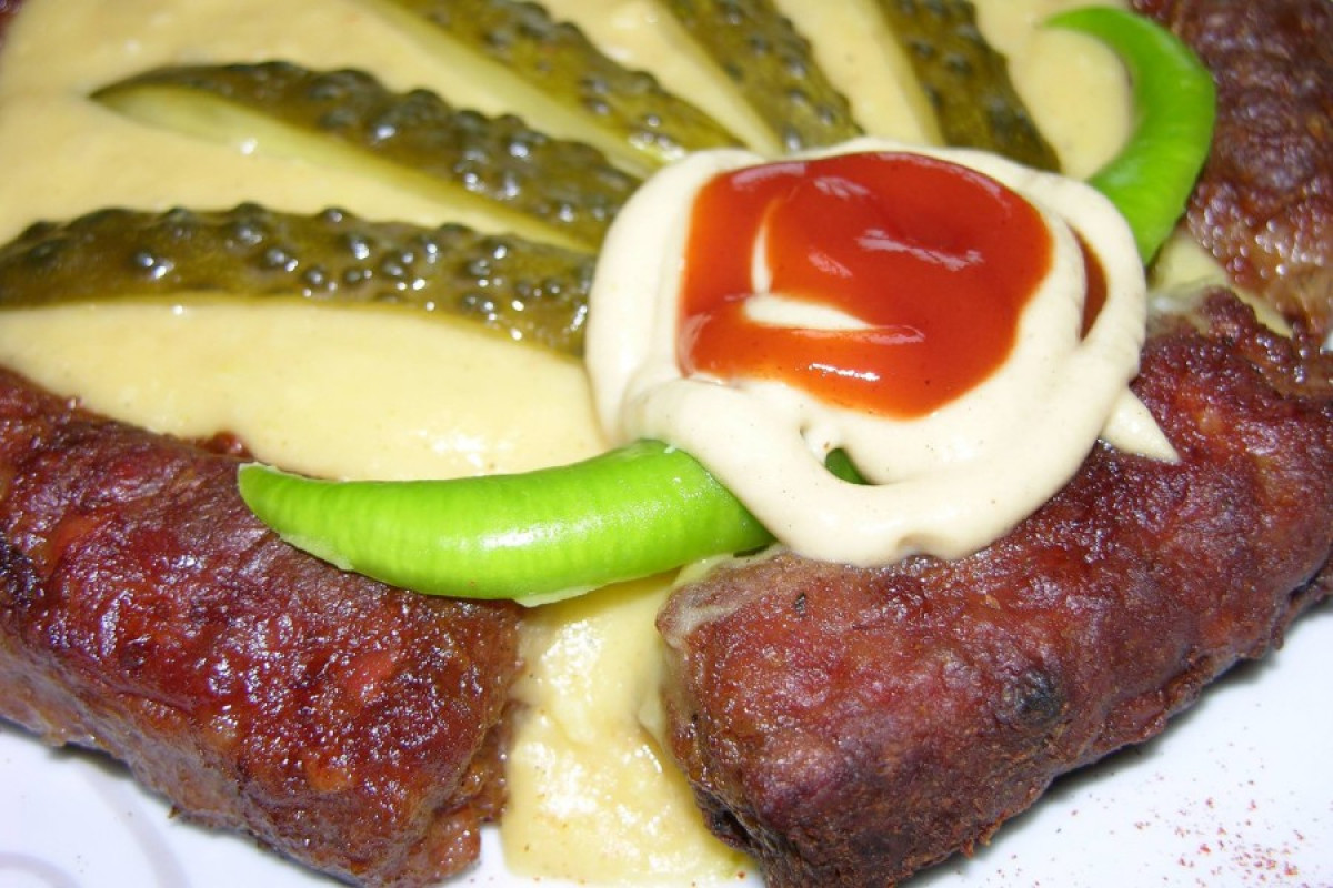 Utána rögtön következhetett a massza összeállítása: fél–fél kiló birka- és marhahús, egy fej hagyma, 4 cikk fokhagyma, 1 kávéskanál csombor (akár kakukkfű, koriander, szegfűbors) és szódapor, só, bors, 2 deci ásványvíz vagy húsleves. Erőteljes kavarás után továbbá beiktattam egy hűtői egynapos pihenőt, „jót tesz neki” alapon. 🙂 Másnap szórakozhattam a formázással (végkövetkeztetés: gömböt alkotni könnyebb, mint hengert), a sütéssel, zenei aláfestésként meg ott rotyogott mellette egy jó sárgaborsó-főzelék. Savanyú káposzta ugyan a képre egyáltalán nem került, ellenben a gyomrunkba annál több!