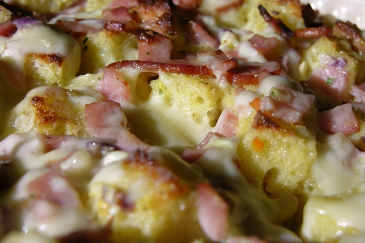 Pitém már önmagában is megállja helyét reggeli vagy vacsorai fogásként, de egy finom krémlevessel kiegészülve már ebédi menüvé is előléphet. A kenyérszeleteket apró kockára vágva beszórom a vajjal kikent piteformába, tetejére még kerül sonkakocka és hagymakocka. Az egészet meglocsolom a felvert (picit tejes) tojással, és beküldöm a sütői melegbe, egy kis irulásra-pirulásra. És voilà, nincs olajszag, sem telefröcskölt kályha (meg Csilla). 🙂