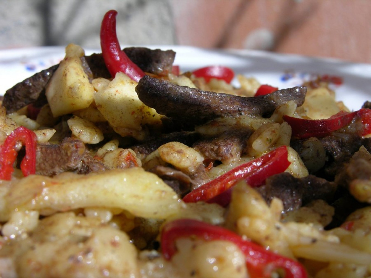 A máj teljes egészében resztelt (a resztelt szó nem a magyar reszel, hanem a német „rösten” igéből származik! 🙂) májként indítja konyhai átalakulását, tehát nagy mennyiségű pirított hagymához és fokhagymához társul (csíkokra vágva).