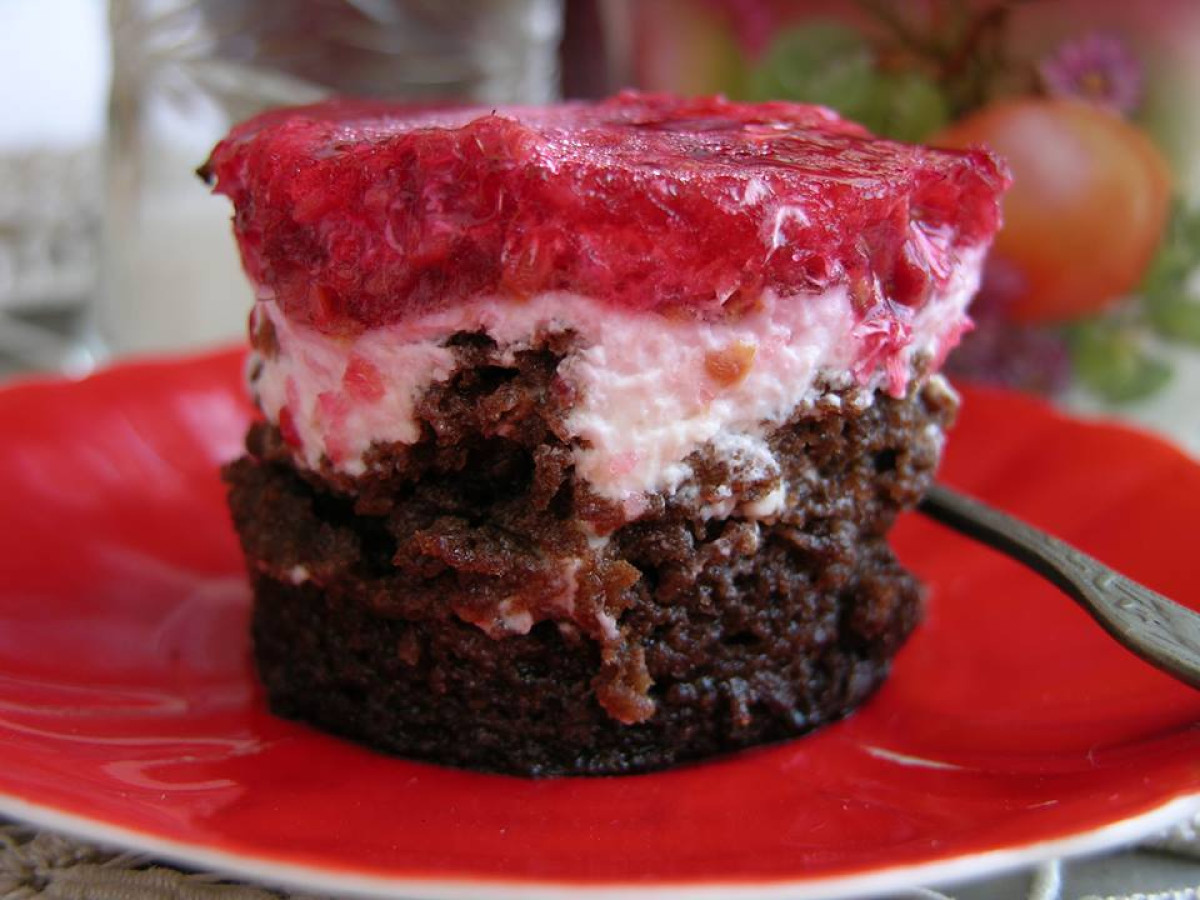 Alapja egy olyan vizes piskóta (4 tojásfehérje habbá verve, 8 kanál víz, szemmértékes mennyiségű cukor és liszt), amelybe kakaót, neszkávét és fahéjat kevertem (kapcsos tortaformában sütve). Első emelet: 900 g joghurt (kis műanyag vedernyi), 2 tasak vaníliás cukor, szemmértékes zselatin. Mely krém összeállítása után azon nyomban elhevert a kihűlt piskótán (kapcsos oldal visszatéve!), és mihelyt dermedt egy kicsit, következhetett rá a második emeletet alkotó málnás krém is: málna, cukor, zselatin (ízlés szerinti mennyiségben).