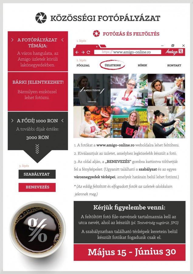 Május 15. és június 30. között az Amigo üzletlánc „Közösségi fotópályázat” címmel elindította Csíkszereda, Székelyudvarhely, Gyergyószentmiklós, Kézdivásárhely és Sepsiszentgyörgy városok lakosait megszólító kampányát, mely során a jelentkezők a város hangulatát megelevenítő képekkel szállhatnak versenybe az összértékben vett 4000 lejes nyereményekért. A pályázatunkra nem csak fotósok jelentkezhetnek, a versenyen minden lakos részt vehet, bármilyen eszközzel készített fényképpel.