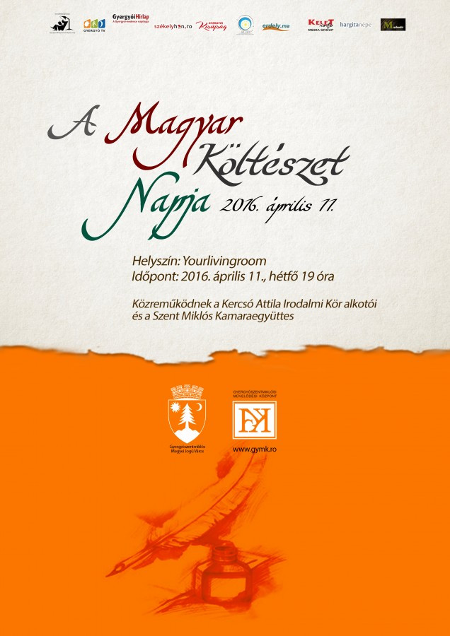 A Magyar Költészet Napját több mint fél évszázada József Attila születésnapján, április 11-én ünnepeljük. A Gyergyószentmiklósi Művelődési Központ ezúttal a Kercsó Attila Irodalmi Kör alkotóit kérte fel, hogy ízelítőt adjanak munkájukból. Április 11-én, hétfőn 19:00 órától a Yourlivingroomba várunk minden kedves érdeklődőt. Közreműködik a Szent Miklós Kamaraegyüttes.