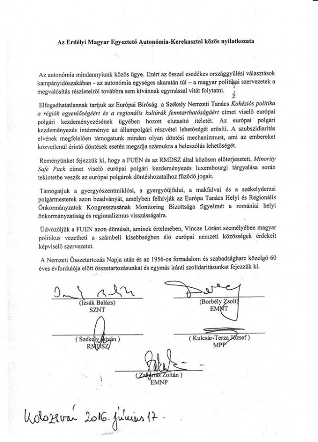 “A Nemzeti Összetartozás Napja után és az 1956-os forradalom és szabadságharc közelgő 60 éves évfordulója előtt összetartozásunkat és egymás iránti szolidaritásunkat fejezzük ki” – áll a dokumentumban, amelyet az RMDSZ részéről Székely István ügyvezető alelnök, az EMNP részéről Zakariás Zoltán alelnök, az MPP részéről Kulcsár Terza József, a párt önkormányzati tanácsának az elnöke, az EMNT részéről Borbély Zsolt Attila alelnök, az SZNT részéről pedig Izsák Balázs elnök írt alá.