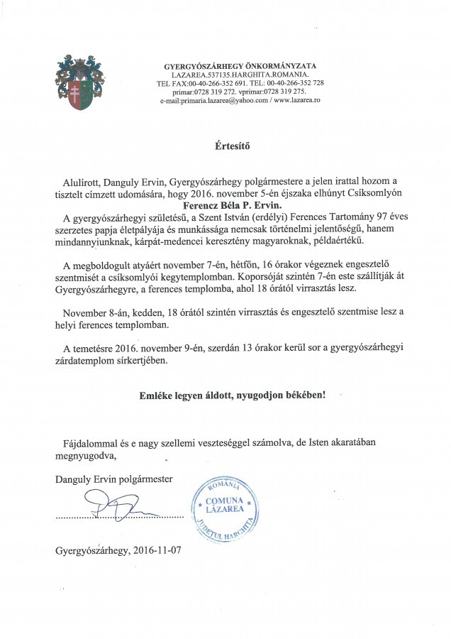 Danguly Ervinnek, Gyergyószárhegy polgármesterének értesítője: