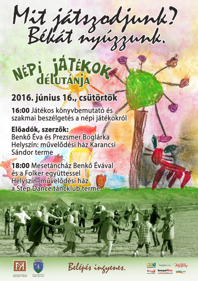 Benkő Áva és Prezsmer Boglárka tart játékos könyvbemutatót és szakmai beszélgetést a népi játékokról 2016. június 16., csütörtökön 16:00 órától a gyergyószentmiklósi művelődési ház Karancsi Sándor termében.