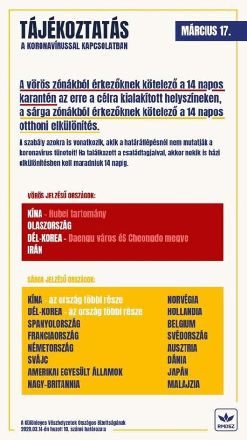 A vörös zónákból érkezőknek kötelező a 14 napos karantén az erre a célra kialakított helyszíneken, a sárga zónákból érkezőknek kötelező a 14 napos otthoni elkülönítés.