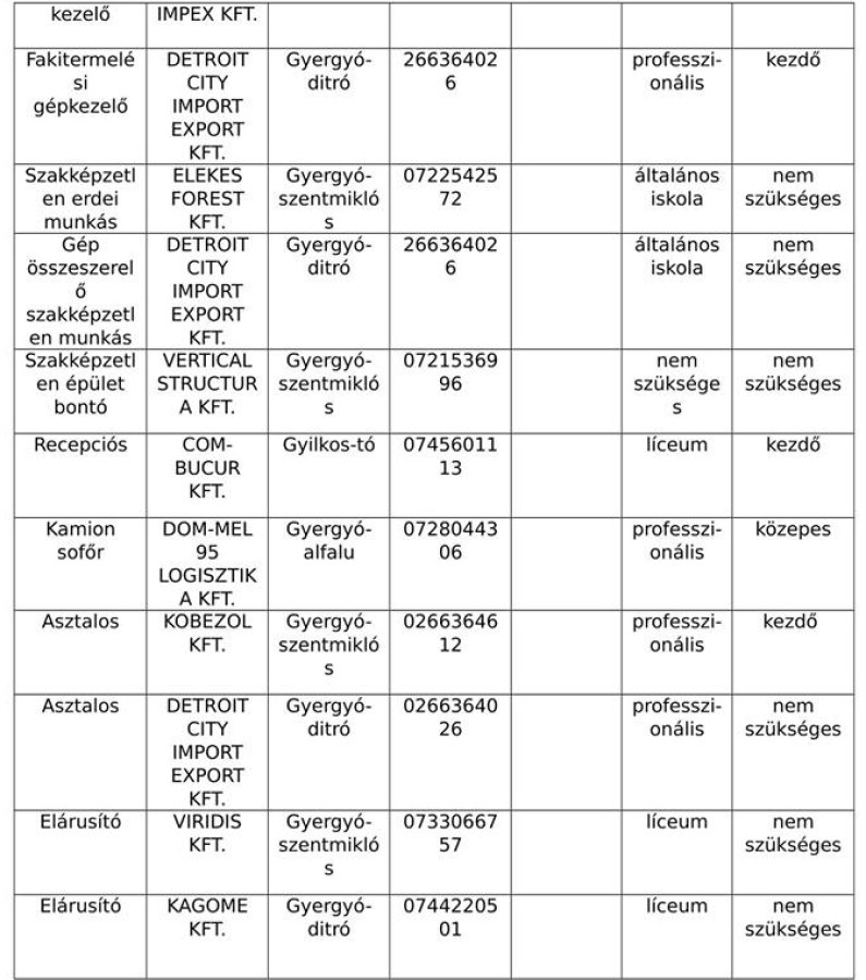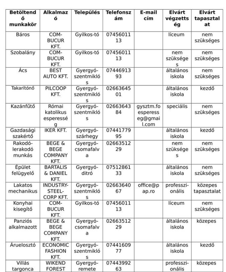 A Hargita Megyei Munkaelhelyező-Ügynökség közlése értelmében az alábbi álláslehetőségek vannak 2018 augusztusában városunkban és környékén.