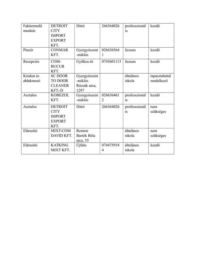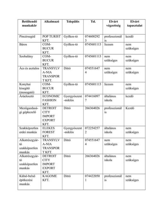 A Hargita Megyei Munkaelhelyező-Ügynökség közlése értelmében az alábbi álláslehetőségek vannak 2018 júliusában városunkban és környékén.
