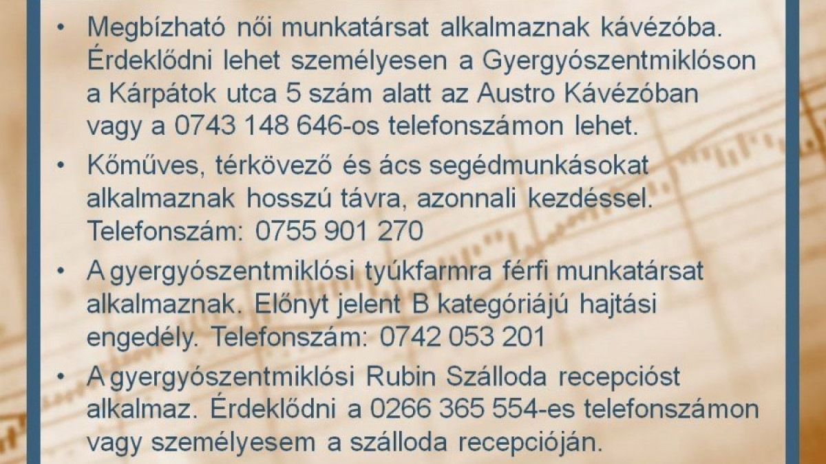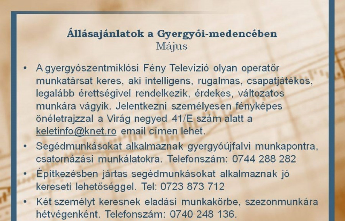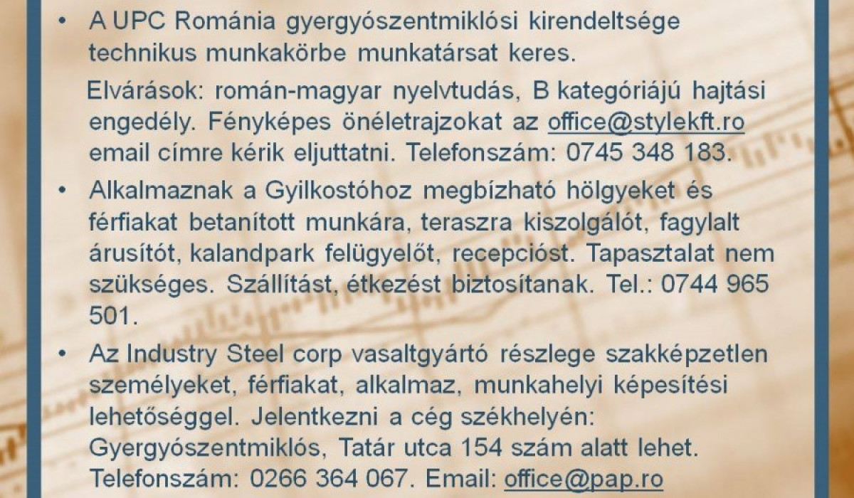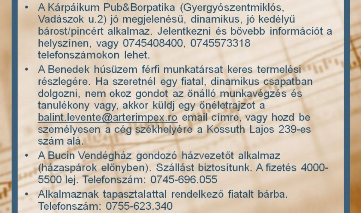 Állásajánlatok a Gyergyói-medencében