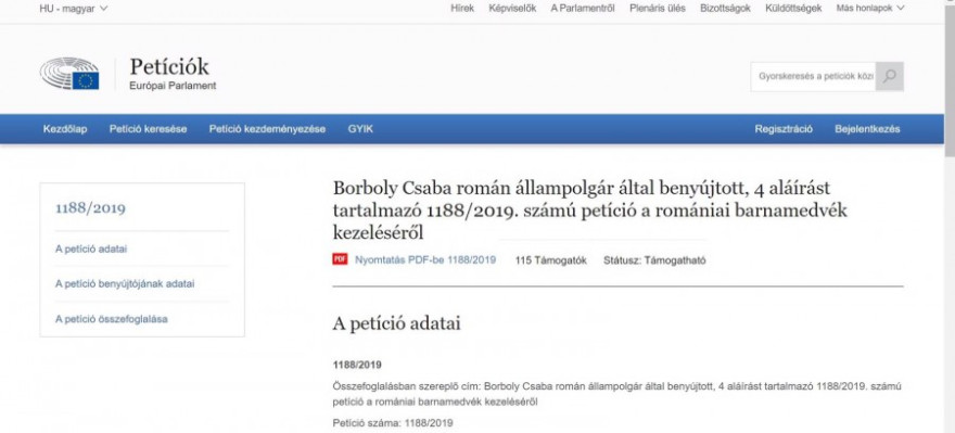 Az emberi élet és javak védelméhez szükséges feltételek biztosítása azokban a romániai térségekben, ahol az elszaporodott medveállomány veszélyezteti ezeket című petíció elérhető a Petíciós Bizottság oldalán az 1188/2019-es számmal