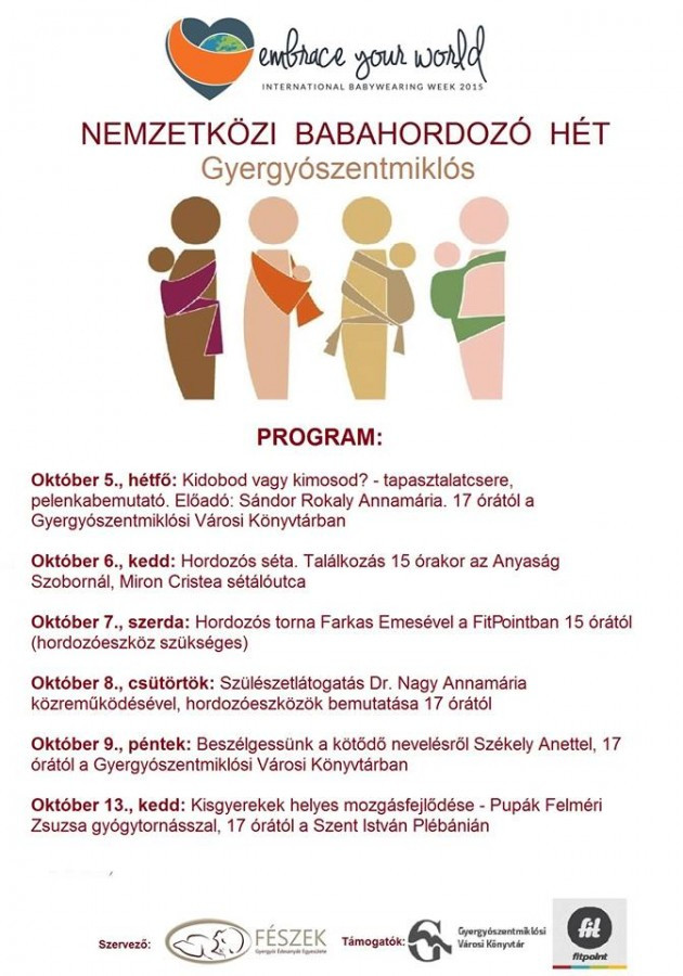 Október 5–11. között tartják világszerte a Nemzetközi Babahordozó Hetet, amit idén másodszor a Fészek, a Gyergyói Édesanyák Egyesülete keretében működő Babahordozós csoport is megszervez Gyergyószentmiklóson. A Nemzetközi Babahordozó Hét célja, hogy minél szélesebb körben felhívják a figyelmet a babahordozás különböző formáira.