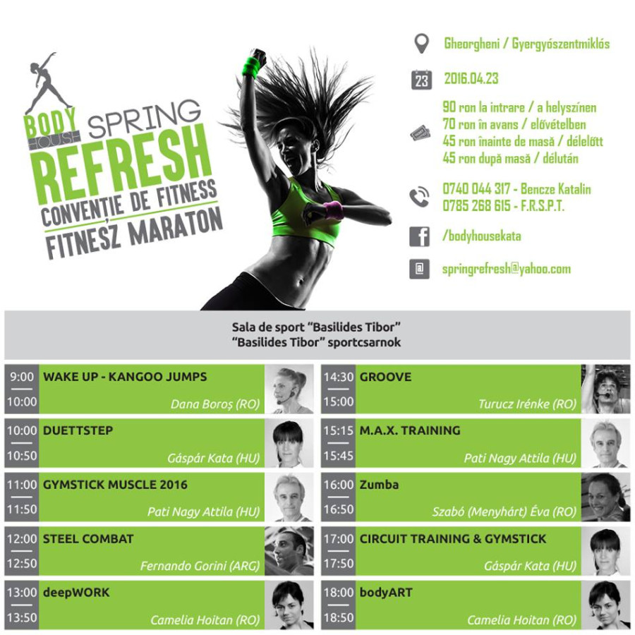 A BODY HOUSE fitness és aerobic terem, a Román Szabadidő Sportszövetséggel közösen szeretettel meghív 2016. április 23-án, szombaton a SPRING REFRESH Nemzetközi Fitness Maratonra!