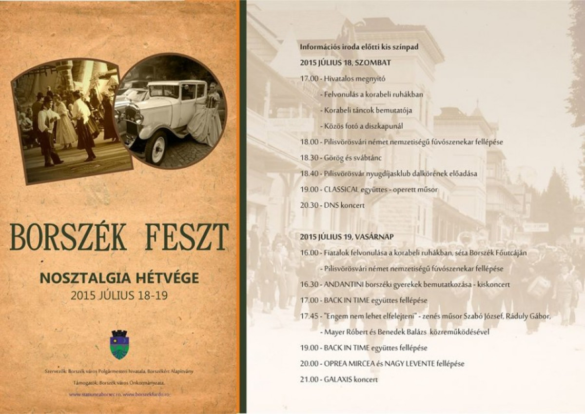A Borszéki Városháza és a Borszékért Alapítvány szeretettel meghív mindenkit rendezvényére, mely a részvevők hozzájárulásával is egyik legsikeresebb rendezvénye a fürdővárosnak. Időutazás: ez az „esszenciája” a múltelemekkel ható, de a turisztikai jövőképért immár negyedszerre megszervezett, hangulatteremtő elemekben gazdag Nosztalgia Hétvégének. A korabeli ruházatban sétáló résztvevők építészeti környezete adott, éppen a városvezetés stratégiáját „lakja be”, miszerint évről-évre a korabeli képeslapok nyomán építik újra a századfordulón arisztokrácia kedvenc üdülőhelyeként létező Borszékfürdő turisztikai szolgáltatásait.