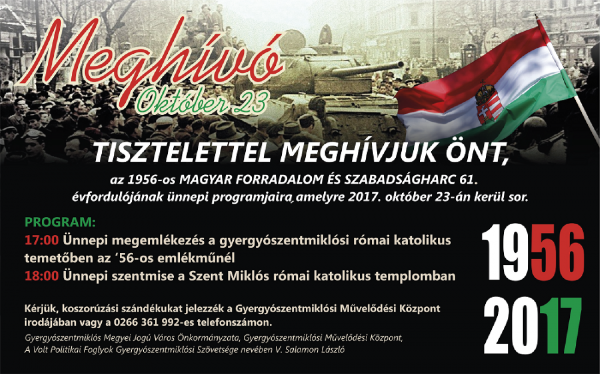 Az 1956-os forradalom és szabadságharc 61. évfordulóján, október 23-án, hétfőn 17 órától a gyergyószentmiklósi római katolikus temetőben az ‘56-os emlékműnél fejezzük ki tiszteletünket a hősök előtt. A Szent Miklós római katolikus templomban 18 órától kezdődő ünnepi szentmisét ugyancsak a hősök emlékének ajánlják.