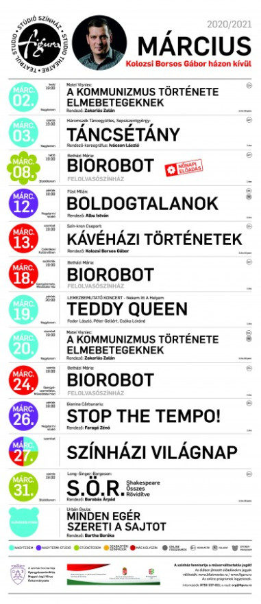 Felfrissül a tavalyi évadban elindított Színész házon kívül nevet viselő nem szokványos színházi program, amelyben elsőként Kolozsi Borsos Gáboré lesz a főszerep. A projekt célja, hogy a nézők a színpadon és (szín)házon kívül is találkozzanak valamilyen formában a társulat előadóival, akik havonta, felváltva kerülnek ebbe a szerepbe. Gáborral a márciusi hónap folyamán különböző platformokon találkozhatnak az érdeklődők, hang- és videóanyagok, képek, valamint interjúk formájában, viszont személyes találkozásra is sor kerül a „GáBorkóstoló” keretén belül. A rendhagyó borkóstolót – a színházi világnap apropóján – március 27-én a YourLivingroom partnereként tartja a társulat színésze. A részvétel előzetes regisztrációhoz kötött, a helyek száma korlátozott. A járványügyi szabályokat figyelembe véve az eseményen kötelező a távolságok betartása, a maszk viselése a bejárattól egészen az asztalig, valamint a kézfertőtlenítés.