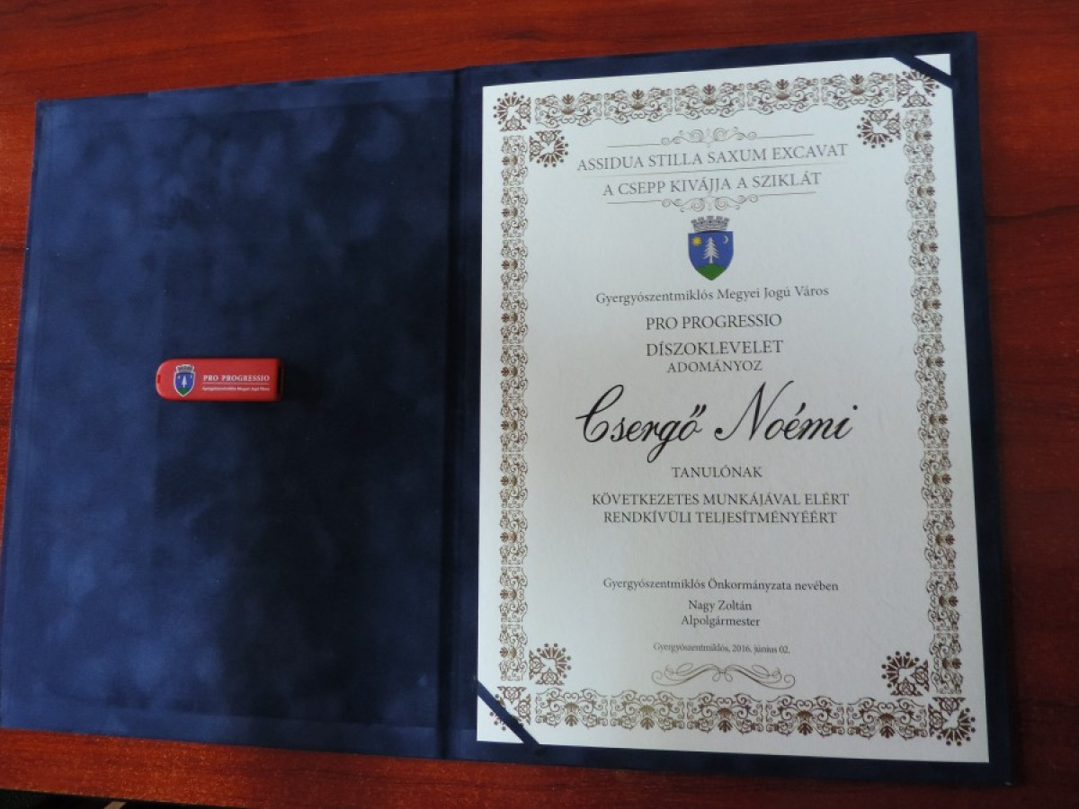 Nem a magas osztályzat tehát, hanem a 9–12. osztályzáró jegyei közötti fejlődés mértéke adta a díj alapját ebben az évben is. Nagy Zoltán alpolgármester az önkormányzat nevében idén is „A csepp kivájja a sziklát” jelmondattal adta át a Pro Progressio díjakat.