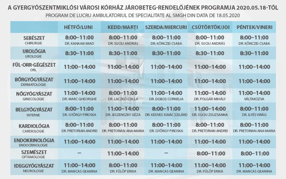 Felhívjuk a lakosság figyelmét arra, hogy a zsúfoltság elkerülése érdekében a járóbeteg-rendelők nem a korábbi program szerint működnek, hanem minden munkanapon egységesen, két időszakban. Egyes kabinetek fél 8 és 11, mások 11 és 14 óra között fogadják a pácienseket, az alább olvasható menetrend szerint. Időpont-egyeztetés a 0266-364.008-as telefonszámon lehetséges.