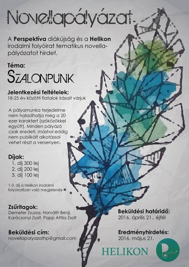 Szalonpunk címmel novellapályázatot hirdet a Perspektíva diáklap és a Helikon irodalmi folyóirat. Kötettel még nem rendelkező, 18–25 év közötti fiatalok írásait várják a szervezők a novellapalyazathp@gmail.com e-mail címre április 21-ig. A pályamunka terjedelme nem haladhatja meg a 20 ezer leütést (szóközökkel együtt). Minden pályázó eredeti, máshol eddig nem publikált alkotással vehet részt a versenyen.