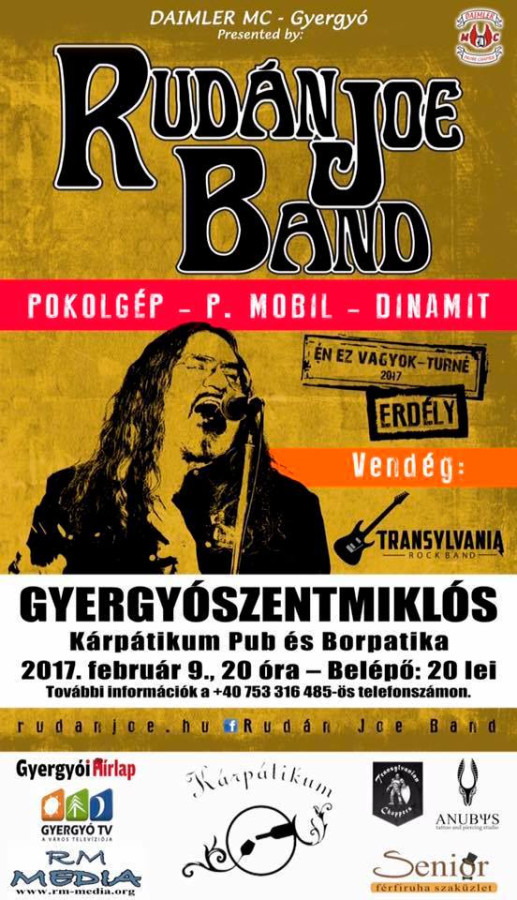 Gyergyószentmiklóson csütörtökön zenél a Rudán Joe Band este 8 órától a Kárpátikum Pub-ban. Vendégzenekar a Transylvania Rock Band.
