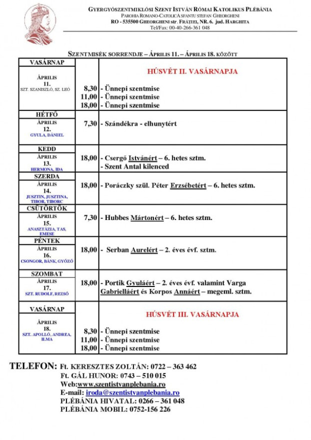 SZENTMISÉK SORRENDJE 2021. ÁPRILIS 11–18. KÖZÖTT