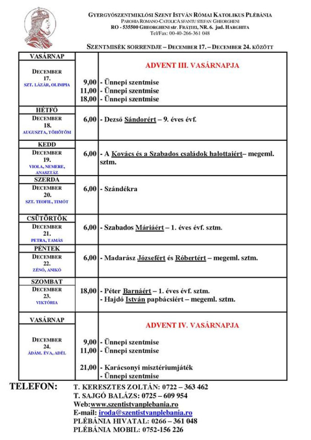 • Karácsony napján a szentmisék a megszokott ünnepi sorrendben lesznek!