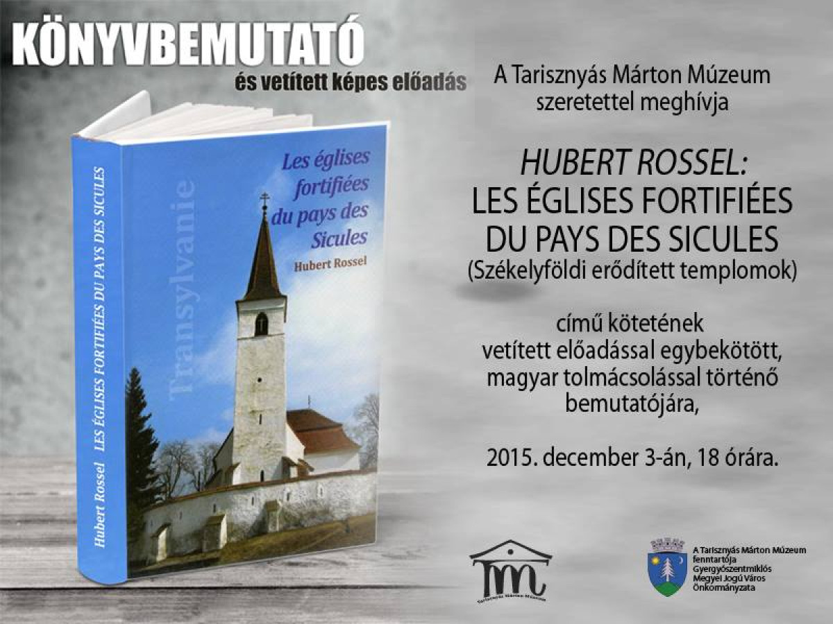 HUBERT ROSSEL: LES ÉGLISES FORTIFIÉES DU PAYS DES SICULES (Székelyföldi erődített templomok) című kötetének vetített előadással egybekötött, magyar tolmácsolással történő bemutatój, Tarisznyás Márton Múzeum