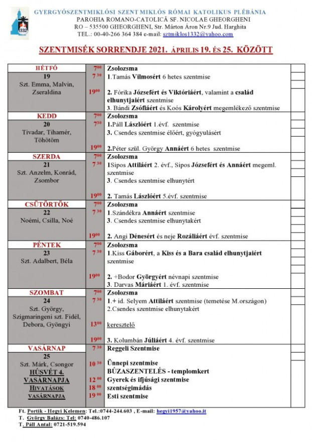 SZENTMISÉK SORRENDJE 2021. MÁJUS 10–16. KÖZÖTT