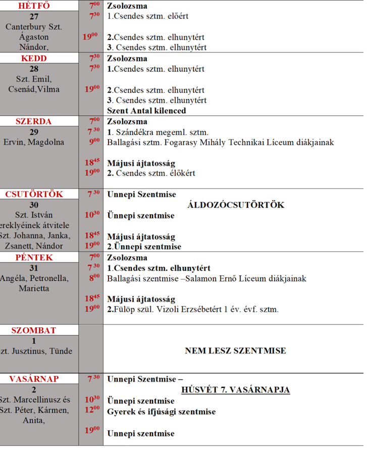 • Csütörtökön, május 30-án Áldozócsütörtök, Urunk mennybemenetelének ünnepe. Szentmisék sorrendje 7:30, 10:30 és este 19 óra. Ezen a napon nincs irodai szolgálat. Ugyanekkor van a Szent István-templom búcsúünnepe. Az ünnepi búcsús szentmise 17 órától kezdődik.