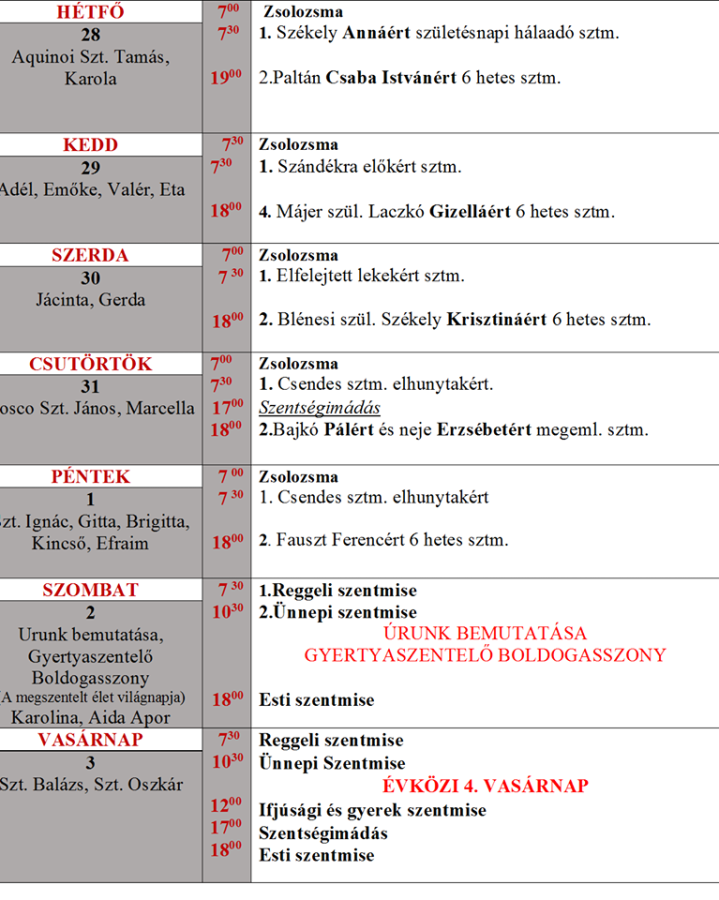 SZENTMISÉK SORRENDJE 2018. OKTÓBER 22–28. KÖZÖTT