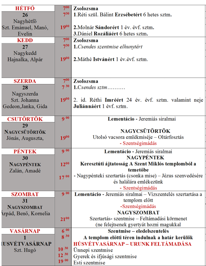 • Húsvéthétfőn a szentmisék sorrendje 7:30 – 10:30 – 12:00 és este 19:00. Nincs iroda szolgálat.